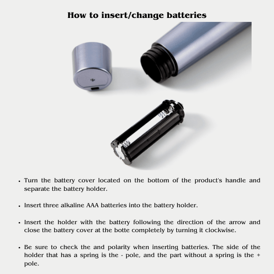 - Always use genuine alkaline AAA batteries and check the polarity when inserting them. - Incorrect insertion may cause malfunction, fire, or injuries.